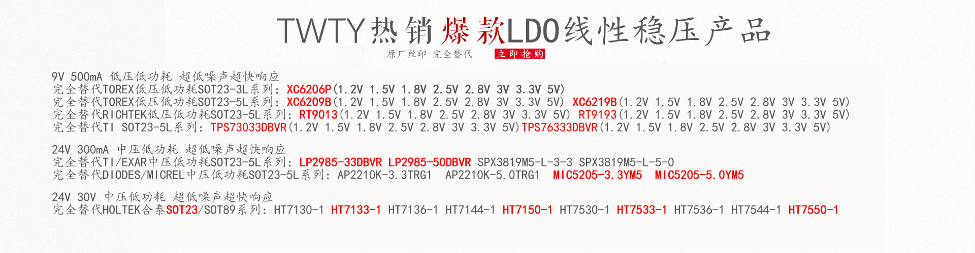 臺灣TY專注致力於電源管理IC及功率器件(MOSFET)Discrete研發、設計、製造、封裝、測試及行銷業務。為提供客戶完整的解決方案及具價格競爭優勢。產品涵盖电源管理、运算放大器,低压LV MOS管、中压MV MOS管、三极管、高频管等,封装形式覆盖SC-70、SC-70-5、SC70-6、SOT23、SOT23-5、SOT23-6、SOT523、SOT323、SOT363、SOT223、SOT89、SOT252、DFN1010、DFN3*3、DFN5*6、SOP8系列。